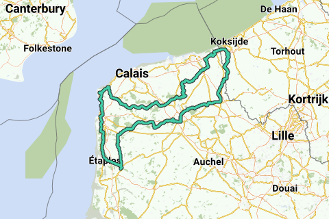 Toeren door de moerassen en langs de kapen van Côte d'Opale. Deze route brengt je langs plaatsen zoals: Kassel, De Panne, Calais wordt ontweken, Boulogne sur Mer om terug te keren naar start en finish in Montreuil sur Mer.