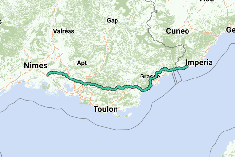 Pelgrimroute voor wandelen tussen San Remo en Arles. De volgende steden liggen op de route: San Remo, Nice, Aix en Provence, Salon en Arles.