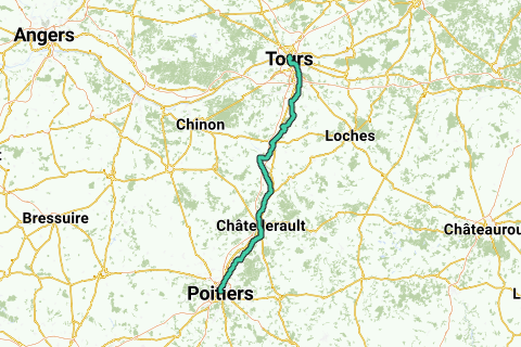 Racebike-variant van een deel van de pelgrimsroute "Via Turonensis" van Tours naar Poitiers, langs Sainte-Maure-de-Touraine en Châtellerault.