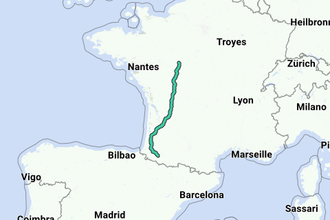 Dit deel leidt je van Tours tot aan de voet van de Pyreneeën (Oloron-Sainte-Marie). Fietsen door uitgestrekte bossen, bekende wijnstreken (zoals St-Emilion) en bezienswaardige steden (zoals Poitiers). Langs pittoreske dorpjes en hoogtepunten van de romaanse bouwkunst.