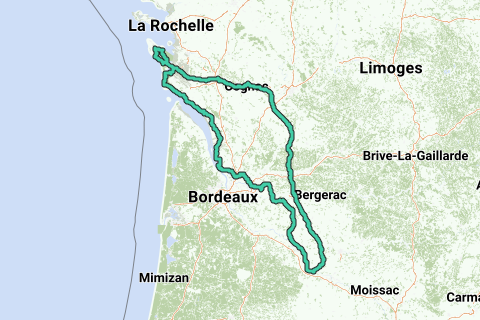 Van Port Sainte Marie over Montpon Ménestrol naar Cognac. Van Cognac over Oléron naar Mortagne. Van Mortagen via Duras terug naar Port Sainte Marie.