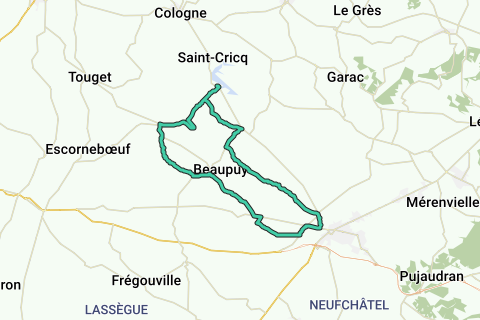 Twee opties voor deze route van 31 km: een halve dag voor ervaren fietsers of een hele dag met een lunchpauze of een verfrissende pauze aan het meer van Saint-Cricq voor minder ervaren fietsers. De route op kleine wegen doorkruist Clermont-Saves, Razengues, Beaupuy en hun kerken met een portaal, terwijl u uitzicht heeft tot aan de Pyreneeën. Daarna kunt u genieten van het rustige platteland tot aan het dorp Thoux. Let op de oversteek van de D654 om bij het zwemmeer te komen. De terugweg leidt u langs het kasteel van Monbrun en volgt de fietsroute 7 van het departement.