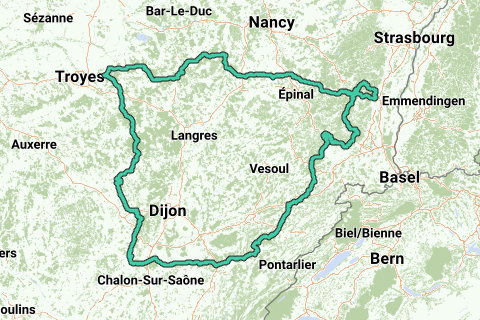 Van de lac d'Orient door de Bourgogne via Flavigny sur Oserain naar Nolay. Van Nolay naar L'Isle sur le Doubs. Van L'Isle sur le Doubs naar Riquewihr via de route des crêtes. Van Riquewihr terug naar de lac d'Orient via de col du Bonhomme.