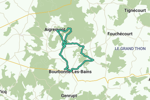 Van het dorpje Senaide gaat het over onverharde wegen naar Serqueux en verder langs rustige asfaltbaantjes tot in de buurt van Aigremont. Daar verder door de bossen en terug naar Serqueux. Onderweg een mooi panorama. Dan gaat het terug naar het vertrekpunt in Bourbonne -les-Bains. Er is een mooie afwisseling van asfalt, veldwegen, bos- en grintwegen.