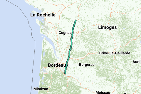 Eerst vrij heuvelachtig, daarna vlak om te eindigen met enkele heuvels. Na 51 km op en af komen we in Châteauneuf sur Charente waar je over de ‘Charente’ rijdt en dan weer klimmen, dalen en weer klimmen naar het hoogste punt van de dag: 179 Hm na 82 km. Na een afdaling bereik je, voorbij Guizengeard, het departement Charente-Maritieme, waar het zachtjes daalt en uiteindelijk vlak wordt. Je verlaat het departement Charente-Maritieme en komt in het departement Gironde. Na 136 km bereik je Libourne en rijd je over de ‘Dordogne’ (5 Hm). Daarna klim je uit deze vallei, naar een plateau om weer te dalen naar de Vallei van de ‘Garonne’, ongeveer 40 km stroomopwaarts van Bordeaux.