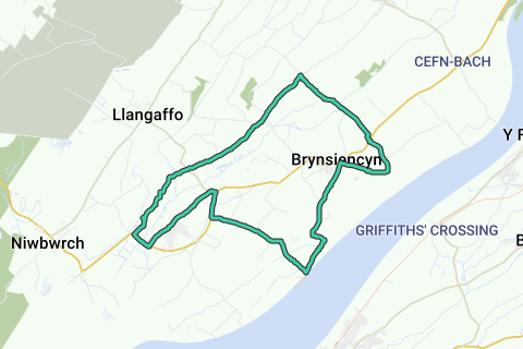 Begint op de gratis parkeerplaats in Brynsiencyn (maar kan ook gestart worden bij Foel Farm of Anglesey Sea Zoo - terwijl de rest van het gezin een van deze plaatsen bezoekt). Een korte lusroute van 10 mijl. Waarschijnlijk het beste tegen de klok in te doen. Passiert de oever van de Menai Strait.