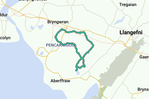 Begint nabij Llyn Coron. 22 kilometer lus. De route maakt gebruik van enkele secties van mijn Gwalchmai-route. Het heeft het voordeel dat het verschillende lange secties omvat waar de hagen aan weerszijden van de lanen niet zo hoog zijn - wat geweldige uitzichten op Anglesey en het vasteland biedt. Er zijn ook enkele interessante wandelingen in de buurt van en rond Llyn Coron - het vertrekpunt.