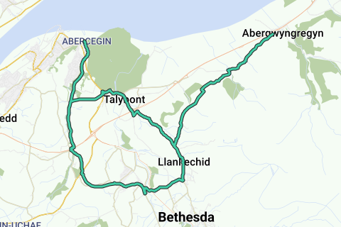 Gebruik fietsroutes aan het begin en het einde van de reis, met een aftakking langs de hoge weg richting Aber, wat spectaculaire uitzichten oplevert. Er is een optionele extra aftakking langs het nieuwe fietspad na het oversteken van de Afon Ogwen bij de Coetmor Bridge, die je naar Bethesda leidt. (Niet weergegeven op deze route omdat het nog niet geregistreerd is op Google Maps!) Ik zou ZEKER aanbevelen om deze route tegen de klok in te nemen om te voorkomen dat je de hele lange heuvel omhoog van Tal y Bont moet gaan. Houd er rekening mee dat de afdaling naar Aber lang en steil is en dat je weer omhoog moet. Ik draai met plezier om na 7,5 mijl, nadat ik de prachtige uitzichten van hoog heb gezien en de route vanaf dat punt heb voltooid.