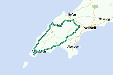 Begin bij Boduan. Volg de rustigere wegen landinwaarts rond het Lleyn-schiereiland via Tudweiliog, Aberdaron en Rhyd y Clafdy. Er is een kort stuk nabij Tudweiliog dat op het eerste gezicht lastig lijkt, maar een fiets kan door de extra grote kuspoort worden genomen en de andere kant is gewoon een gewone, onop slot poort. De route kan het beste tegen de klok in worden gevolgd. 36m