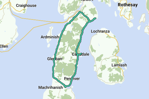 Campbeltown Pier, langs de oostzijde van Kintyre, met uitzicht op het eiland Arran. Neem Sadell, Carradale en een excursie naar Skipness in je op. Vervolgens over de heuvel naar de westzijde en een cruise langs de niet al te drukke hoofdweg, met stranden en uitzichten op Isla en Jura. Terug naar Campbeltown met zijn cafés en bars. Denk dat de startracker de hoeveelheid verkeer overschat! Niets om je als een zelfverzekerde fietser zorgen over te maken, naar mijn mening. Dit deed ik op een Brompton, maar het is beter om iets te hebben met een paar meer versnellingen en grotere wielen, tenzij je van plan bent de bus te nemen! Lees onze blog over fietsen in Kintyre op https://www.sevendaycyclist.com/cyclin-kintyre