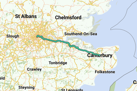 Londen naar Canterbury Pelgrimsweg voor Racefiets die de Thames volgt, vervolgens Greenwich Park bezoekt, door de buitenwijken naar Gravesend gaat en verder naar de Medway-steden, waar de Saksische kust wordt gevolgd, voortzetting via Faversham om de Canterbury Kathedraal te bereiken, locatie van het Heiligdom van Thomas Becket.