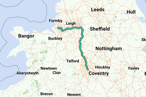 Racebike-versie van een pelgrimsroute van Saint-James die van Liverpool naar Birmingham gaat, langs Stockport, Stoke en Walsall. Deze route maakt deel uit van het Camino-netwerk dat naar Santiago de Compostella gaat.