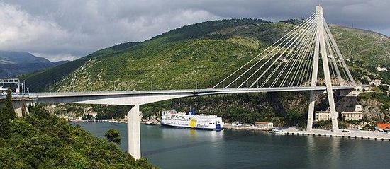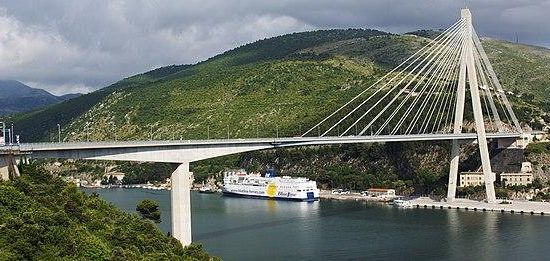De tweestrookskustweg van Split naar Dubrovnik is langs vele baaien aangelegd, waardoor het tracé veel langer is dan de hemelsbrede afstand tussen de twee plaatsen. Om de weg twaalf kilometer te verkorten werd tussen 1998 en 2002 de Franjo Tuđmanbrug aangelegd. Vanuit Split gezien kan men de brug over om Dubrovnik te bereiken; gelijk na de brug kan men rechtdoor om de randweg van Dubrovnik op te gaan of linksaf en vervolgens onder de brug door om het noordwestelijke stadsgedeelte in te gaan. De brug bevindt zich zo'n zes kilometer van de historische stadskern.