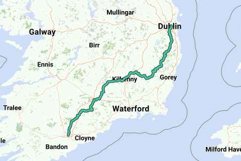 Pelgrimroute voor wandelen tussen Cork en Dublin. De volgende steden liggen op de route: Cork, Cahir, Kilkenny en Dublin.