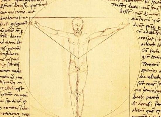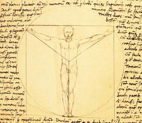 Vitruvius beschreef in het Latijn in zijn geschrift "De architectura" de verhoudingen van het menselijk lichaam en gaf voorschriften voor tempelbouw. Hij legde uit dat het lichaam precies in een omgeschreven cirkel of vierkant met de navel als middelpunt past, respectievelijk Homo ad circulum en Homo ad quadratum . Vitruvius ging niet in op verschillen tussen man en vrouw, maar beschreef een algemeen menselijk lichaam.