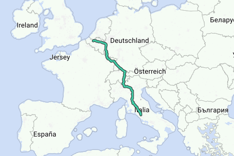 De volgende 10 landen worden aangedaan: België, Nederland, Duitsland, Frankrijk, Luxemburg, Oostenrijk, Zwitserland, Liechtenstein, Italië, Vaticaanstad.