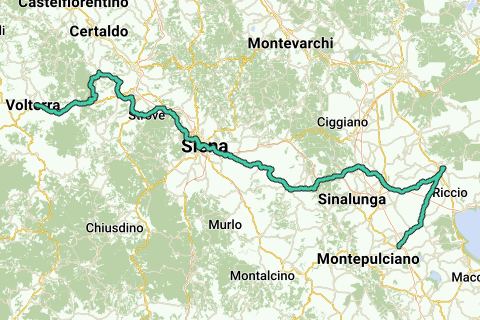 Route laatse 2 ritten in Toscane 2024 van Volterra naar Acquaviva. In Siena komen we terug op de Strade Bianchi op 5 km van de finish, Eerst daalt de weg tot op 1,7 km van het einde waar de route over 500m met 12% gemiddeld en de steilste strook is 16%. weinig hotels na Siena eventueel stoppen in Casetta