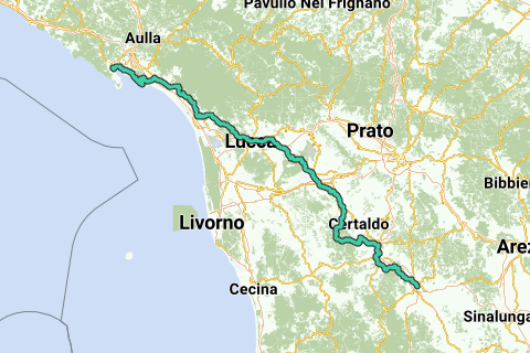 Pelgrimroute voor mountainbikes tussen Siena en La Spezia. De volgende steden liggen op de route: Siena, Lucca, Massa, Lérici en La Spezia. Deze route maakt deel uit van de "Via Francigena".