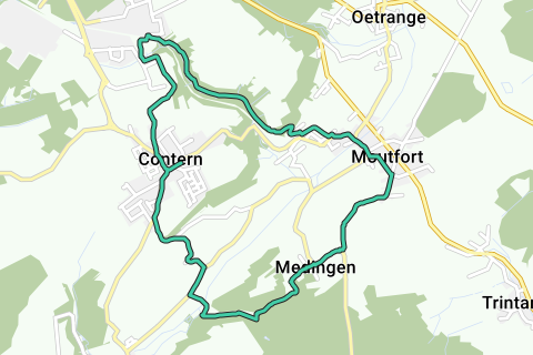 Wandelroute van Contern. Het bewegwijzeringsteken van de wandelroute bestaat uit een blauwe pijl/vlag op een witte achtergrond. De route voert je door schilderachtige landschappen, waar je kunt genieten van de natuurlijke schoonheid van de omgeving. Je komt langs glooiende heuvels en groene velden, met af en toe een prachtig uitzicht op de omliggende natuur.