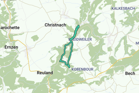 Deze route laat je genieten van verschillende hoogtepunten die het Müllerthal rijk is. Eerst volgt men de vallei van de Zwarte Ernz een stukje om verderop door de idyllische vallei van de Gluedbaach te stijgen om weer af te dalen naar de Zwarte Ernz. Dit zuidelijke lusje is bijna 6 km. De Kalktuffbron is in deze lus te zien. Wie niet zo avontuurlijk ingesteld is kan enkel dit lusje doen. Aan de CR 118 is een ruime parking voorzien.