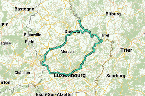 Van Echternach via Luxemburg tot de Belgische grens. Via Diekirch en de vallei van de Sûre terug naar Echternach. Deze route maakt een zijsprong naar Vianden waardoor ze op 158 km uitkomt. Zonder deze zijsprong, eindig je op 130 km.