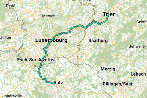 Rennfietsv variant van de Saint-James-wandelroute van Trier naar Thionville langs Luxemburg. Deze route is onderdeel van de Jakobsweg, die naar Santiago de Compostella leidt.