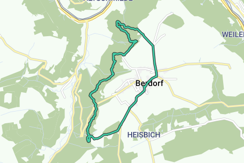 We beginnen met de B5. We verlaten het dorp langs de kerk in de richting van de Aquatower met een prachtig panoramisch uitzicht op de regio aan het einde van het dorp, tot het pad uiteindelijk het bos in leidt. Een mooie afdaling tussen bizarre rotsformaties leidt langs het Berdorfer-plateau naar het Werschrummschlëff, een labyrintachtig rotskloofcomplex waar men bij warm weer goed kan afkoelen. Direct naast de Werschrummschlëff kan men de Priedegtstull beklimmen voordat u doorgaat met uw wandeling. Nadat men de weg heeft overgestoken, loopt de weg voort door Binzeltschlëff en vele andere rotsformaties en grotten zoals Hell.