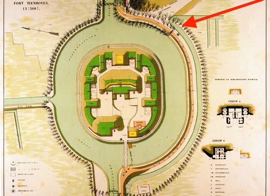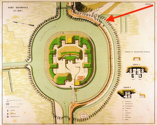 U staat nu bij de brughoofden van de brug die naar fort Tienhoven voerde. Dit forteiland is in 1844-47 gebouwd om de iets verder gelegen Kraaijenestersluis naar de Vecht en het Tienhovens Kanaal met de ernaast gelegen kade te beschermen. Deze vormde een goed begaanbare doorgang dwars door de hoofdverdedigingslijn van de NHW, een zogenaamd acces. Op het eiland werd een verdedigbaar wachthuis van 15 bij 15 meter gebouwd met muren van 1 tot 2 meter dik en eenvoudige rondgaande aarden beschermingswal.