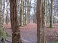 Tussen de hoge beuken schuin oversteken richting boerderijtje.