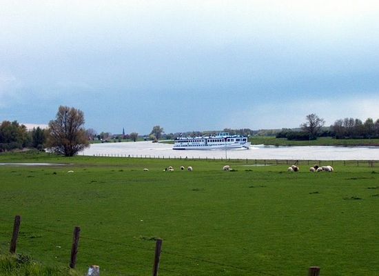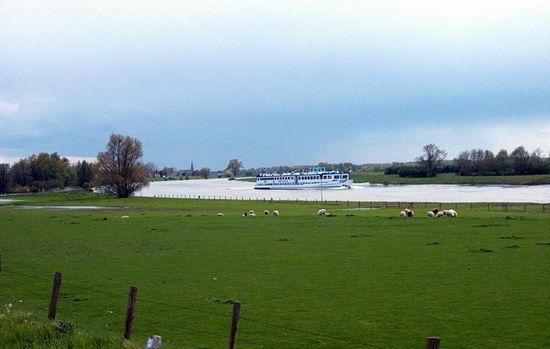 Vanaf de dijk bij Bronsbergen hebben we een mooi gezicht over de rivier de IJssel met op de achtergrond de contouren van de Veluwe.