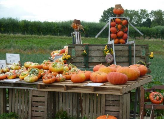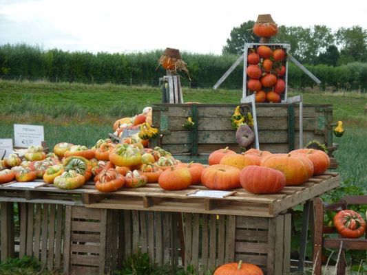 Meer dan 50 verschillende soorten sier- en eetpompoenen te koop. Daarnaast worden ook decoratieve producten verkocht in een overdekte ruimte in de oude schuur op het erf van het Hof Geersdijk.
