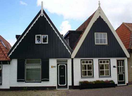 Fietsen door de De Ruyterstraat (naar Michiel Adriaenszoon de Ruyter, die vaak in Oudeschild verbleef om dicht bij zijn vloot te kunnen zijn) is fietsen door een bijzonder pittoresk deel van Oudeschild. Maar liefst 12 panden in deze straat hebben de status van rijks- of gemeentelijk monument, waaronder deze twee naast elkaar gelegen huisjes met het karakteristieke houten voorschot, in dit geval voorzien van ramen.