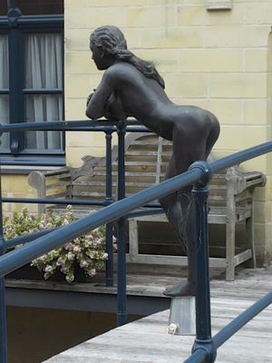 Dit beeld zal je zeker opvallen. Het is een beeld die een naakte vrouw voorstelt glurend over de Geul.
