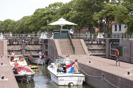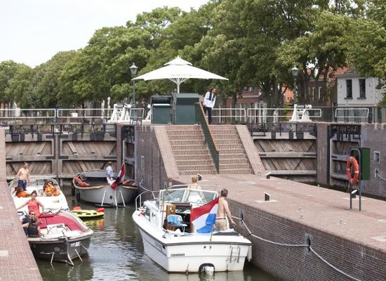 De Groote Zeesluis. De naam geeft het al weg, je kijkt hier naar een enorme constructie. Dit is de verbinding tussen de rivier de Vecht en het IJmeer. Ze werd gebouwd aan het einde van de 17e eeuw. Ze zou enerzijds de streek van de Vecht beschermen tegen overstromingen. Anderzijds zou de sluis ook een militair wapen worden, want dankzij deze sluis kon men zorgen voor inundaties. Als men de sluis openzet, komen de weilanden erachter onder zo'n 40 cm water te staan. Te hoog water om doorheen te wandelen, en te laag om doorheen te varen. De vijand kan dus niet meer naar je toe. Dat noemt men dan in militaire termen: 'een waterlinie vormen'.