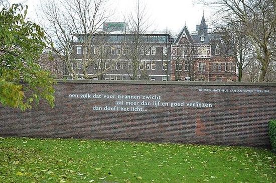 Het plantsoen kent twee bouwwerken. Het eerste is een muur waarop in letters een eindregel van een gedicht van Van Randwijk is aangebracht: