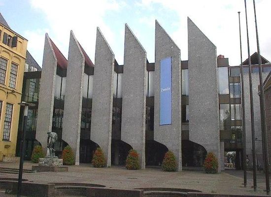 Het huidige pand van het stadhuis van Zwolle begon bij de vervanging van de oude raadhuis aan het Grote Kerkplein door het Raadhuis en het Wijnhuis aan de Sassenstraat en de Raadhuistoren aan het Grote Kerkplein. Door aankoop en verbouwing werden in de Sassenstraat nog het Meentehuis en het Dirk Mosterthuis aan het complex toegevoegd. Van deze panden bleven het Raadhuis, het Meentehuis en het Dirk Mosterhuis behouden. In 1821 werden ze ingrijpend en vrijwel onherkenbaar gemoderniseerd en onder een gepleisterde lijstgevel samengevoegd. De laat-gotische natuurstenen gevel voor het Raadhuis en het Wijnhuis is toen gesloopt.