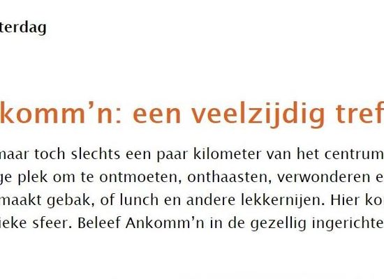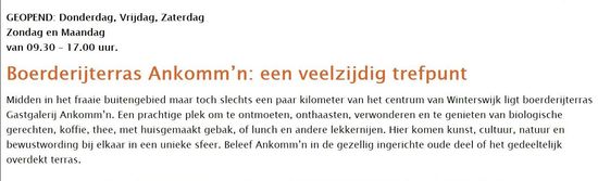 Midden in het fraaie buitengebied maar toch slechts een paar kilometer van het centrum van Winterswijk ligt boerderijterras Gastgalerij Ankomm’n. Een prachtige plek om te ontmoeten, onthaasten, verwonderen en te genieten van biologische gerechten, koffie, thee, met huisgemaakt gebak, of lunch en andere lekkernijen. Hier komen kunst, cultuur, natuur en bewustwording bij elkaar in een unieke sfeer. Beleef Ankomm’n in de gezellig ingerichte oude deel of het gedeeltelijk overdekt terras.