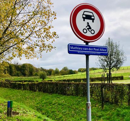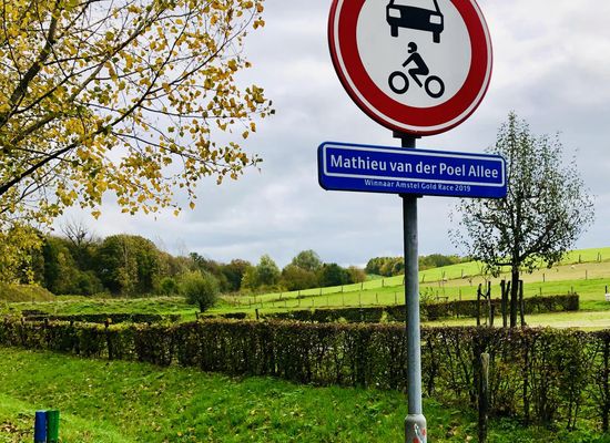 Mathieu van de Poel allee. Winnaar van de Amstel Gold Race 2019. Eerbetoon aan de indrukwekkende overwinning van Mathieu van der Poel die hier zijn oorsprong (Oeveregrubbe) kent. Wielerhistorie.