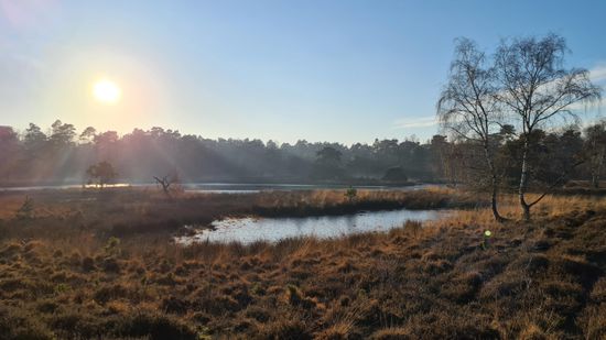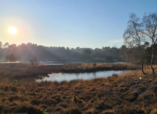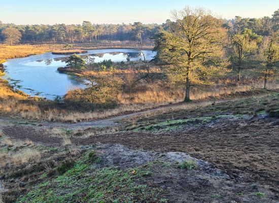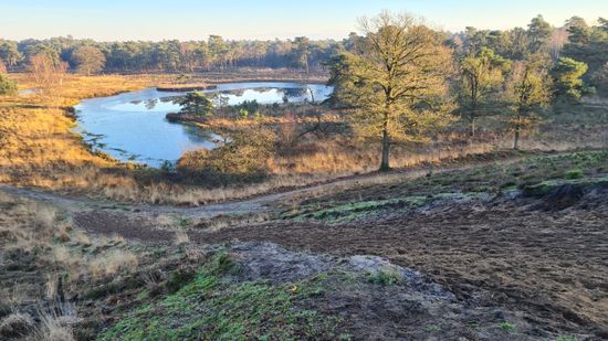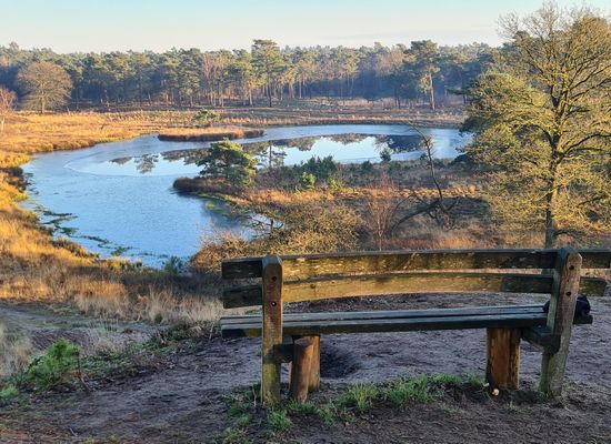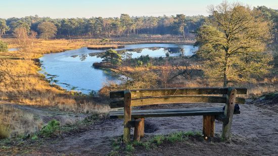 Vanaf dit punt heb je een mooi uitzicht over de Duvelskuul, één van de mooiste plekjes in de Maasduinen.