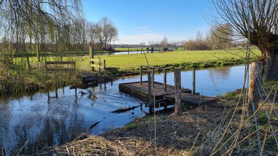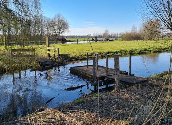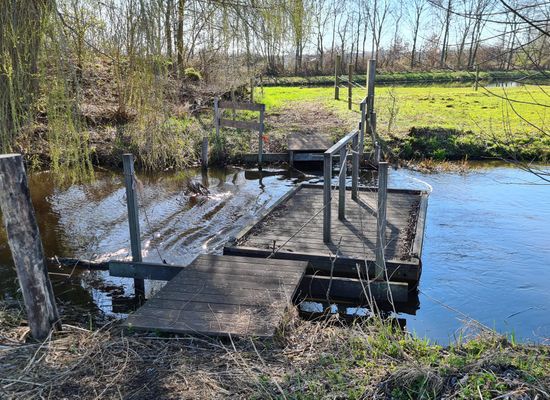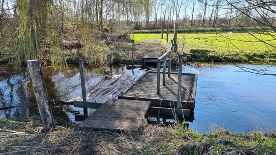 Een klein pontje over een zijtak van de rivier de Aa. Deze zijtak gaat om de stuw richting de Kildonkse watermolen waar hij het schoepenrad van water voorziet.