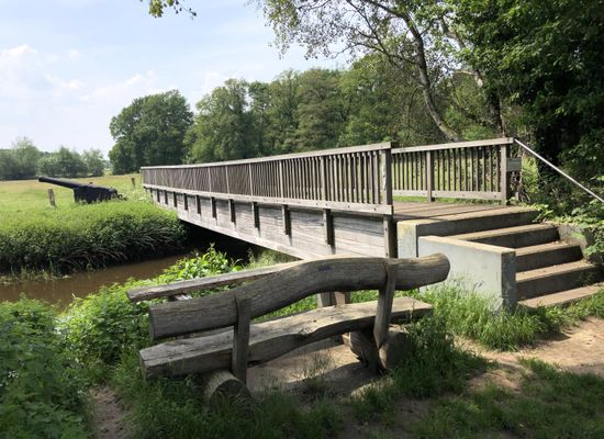 Dit is een historische plek stonden. Tijdens de 80 jarige oorlog probeerde Prins Maurits met zijn troepen de Dinkel over te steken. Schrik niet, met 9.000 infanteristen, 1.600 paarden en kanonnen! De brug was helaas niet sterk genoeg om met name het geschut te dragen. De brug werd daarom met boomstammen versterkt.