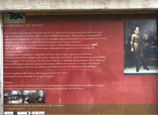 De bevrijding van Ootmarsum kostte zegge en schrijve drie kanonsalvo's. In Oldenzaal lagen 400 Spanjolen. Die schrokken zich een hoedje van de Oranje overmacht. Volgens het informatiebord verliep de verovering van die stad op een bijzondere manier. Een dronken officier loste een paar kanonschoten richting Oldenzaal. Dat was voor de Spanjaarden genoeg om er vandoor te gaan. De brug is later vernoemd naar Prins Maurits.