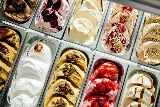 In de ijswinkel tref je een ijsvitrine met vierentwintig smaken schepijs. Klassieke favorieten zoals vanille, chocolade en aardbei worden naar een hoger niveau getild. Bij IJsbaas worden voortdurend nieuwe creaties zoals: lemon, cheesecake, cookies en Ferrero Rocher gecreëerd.