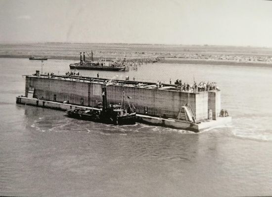 Op de eerste foto ziet u een caisson, varend naar de Braakmanpolder.