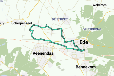 Via Groenendaal en De Fliert naar de Dennen. Dan via Immenberg langs spoorlijn naar Ede terug