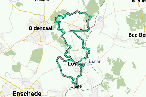 Vanuit het Lutterzand rijd je via het Arboretum zo Duitsland in, waar het genieten is van het mooie bosgebied rond klooster Bardel en de waterplassen. Je rijdt al snel Losser weer in en via de rand van het dorp rijd je langs de slingerende Dinkel richting Glane waar het genieten is op het mooie Lagapad dat langs de Dinkel loopt, met een stuk vlonderpad. Via Penninkskotten en het Haagse Bos rijd je weer richting Losser, dit keer aan de westkant. Als je de steenfabriek ziet, rijd even het dorp in op zoek naar een terrasje in het centrum. Daarna gaat de route verder langs het Smoddebos en Duivelshof waarna je nog 1x de A1 oversteekt. Via Elfterheurne rijd je de Tankenberg op, een lekker klimmetje maar niet lang daarna gaat het alleen nog maar heuvelaf en ben je bijna in het Lutterzand.