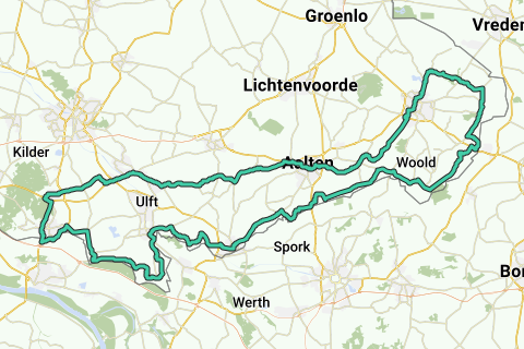 Grensroute langs de Duitse grens met Nordrhein- Westfalen naar Winterswijk. Terug naar startlocatie via Aalten, Terborg naar Drive-thru Broods in Zeddam-Montferland.