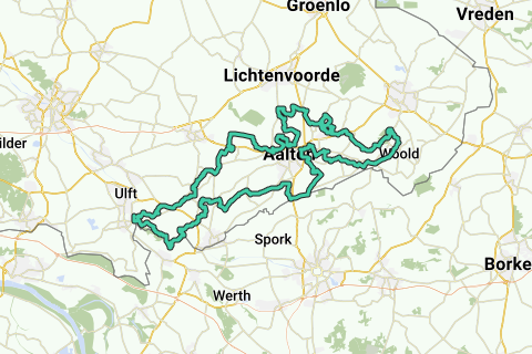 De route voert je door de zuidelijke Achterhoek, tegen de grens met Duitsland (en in het begin net in Duitsland), naar het oosten via De Heurne en net oostelijk van Aalten. Hoe oostelijker je komt, hoe duidelijker het coulissenlandschap wordt: onregelmatige percelen gescheiden door heggen en houtwallen. Vervolgens fiets je over de vele gravelwegen en gravelfietspaden rond gehucht Woold (nabij Winterswijk) en door natuurgebied Bekendelle waar je na 45 km de Berenschotse Watermolen passeert (waar je kunt pauzeren). Dit is het keerpunt van de route en dan ga je weer westwaarts. Je fietst dan deels rond de Slingeplas en je komt na 55 km net niet in boekenstadje Bredevoort (je kunt even doorfietsen naar Bredevoort zelf (komt er anderhalve kilometer bij) om daar te pauzeren). Vervolgens fiets je enkele keren over de terrasrand van het Oost-Nederlands plateau, net ten noorden van Aalten, over licht heuvelachtig terrein met hoogteverschillen tot 15 meter.