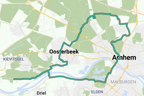 Vanaf Schelmseweg door Arnhem centrum, via Mandelabrug door Meinerswijk (niet op de kaart aangegeven). Bij zuidwestuitgang Meinerswijk rechtsaf op de dijk. Via fietsveer naar de overkant van de Rijn, naar Kasteel Doorwerth. Terug, via Oosterbeekstation, Airbornekerkhof, Amsterdamseweg oversteken en door het bos naar startpunt.