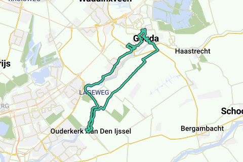 We beginnen met een klein ommetje door Gouda om de drukste wegen te vermijden. Zo komen we door langs een park en vervolgens door een volkswijk bij de juliana sluis terecht. Van hieraf nemen we de route langs de ringvaart richting Moordrecht. Deze weg langs het water blijven we volgen tot iets voor een gemaal. Hier steken we het water over en volgen dijk richting Nieuwekerk.